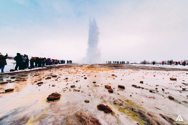 Unser nächster Stopp ist das geothermale Gebiet Geysir. Das komplette Gebiet misst eine Fläche von circa 3m² und ist sehr faszinierend. Benannt ist dieses Gebiet nach dem ältesten und bekanntesten Geysir in Island. Ebenfalls in diesem Gebiet befindet sich der aktive Geysir Strokkur. Strukkur ist der energiegeladenste Geysir in ganz Island, alle paar Minuten spuckt er Wasser bis zu 30m hoch in die Luft – ein wahres Spektakel! Mehr über Geysir Geothermal Field.