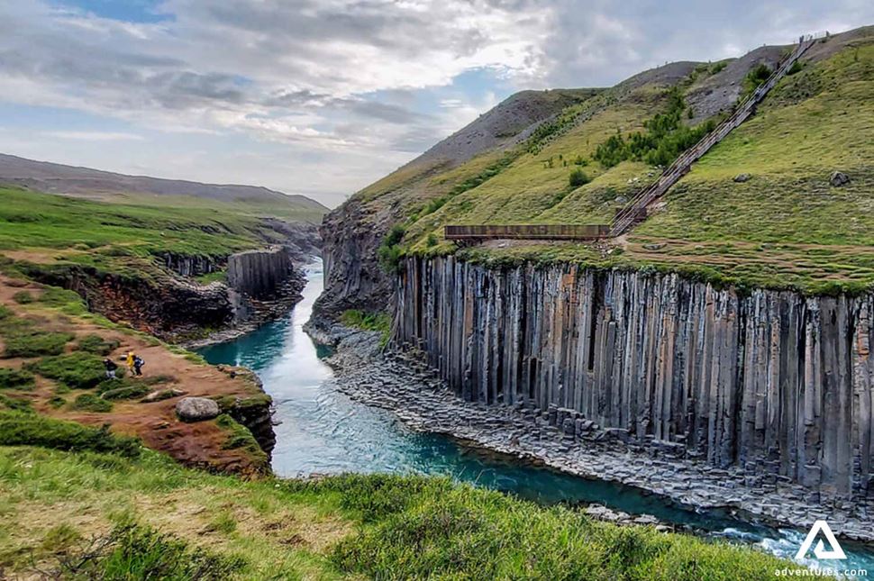 Am vierten Tag fahren wir in Richtung Nordisland. Nachdem wir Egilsstaðir hinter uns gelassen haben, fahren wir durch ein Hochlandgebiet, wo die Landschaft karg und außerirdisch ist. Zuerst besuchen wir den Stuðlagil Canyon, eine der bezauberndsten Basaltfelsen der Welt.