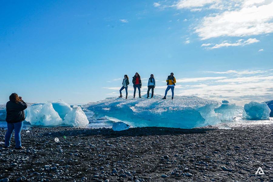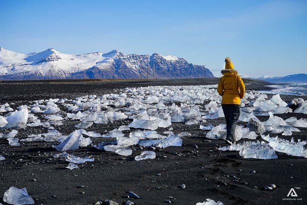 Die Eisberge treiben alle Richtung Ozean in der Nähe der Gletscherlagune. Einige von ihnen werden aber an den schwarzen Sandstrand gespült, wo Sie dann wie glitzernde Diamanten auf dem tiefschwarzen Sand liegen bleiben.
