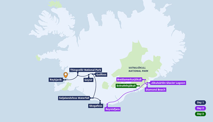 Atemberaubende Landschaften, den Goldenen Kreis, Eishöhlen, die Jökulsárlón-Gletscherlagune und eine Nordlichterjagd. Entlang des Weges werden wir Wasserfälle, Vulkane, treibende Eisberge, Klippen, schwarze Sandstrände, Heiße Quellen und vieles, vieles mehr entdecken können. Es gibt sogar die Möglichkeit an einer Gletscherwanderung teilzunehmen oder die Geheime Lagune zu besuchen und während der Sommermonate können Sie eine Bootstour auf der Jökulsárlón-Gletscherlagune hinzufügen.