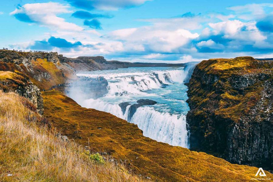Der Wasserfall Gullfoss (Goldener Wasserfall) ist unser nächstes Ziel. Der Wasserfall befindet sich im Fluss Hvita, welcher vom Gletscher Langjökull kommt und in mehreren Stufen in die Tiefe stürzt.