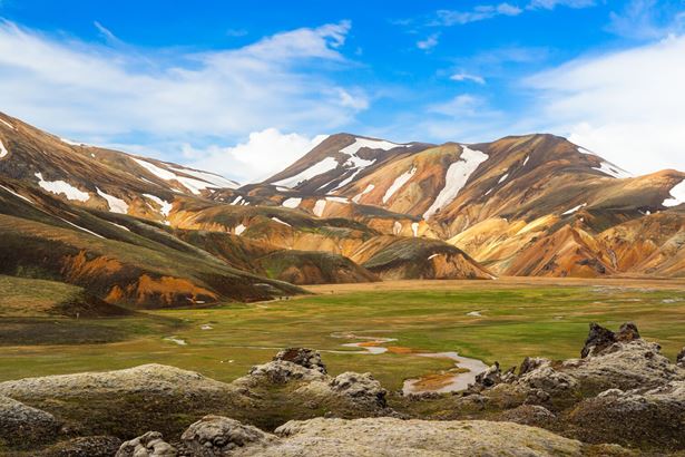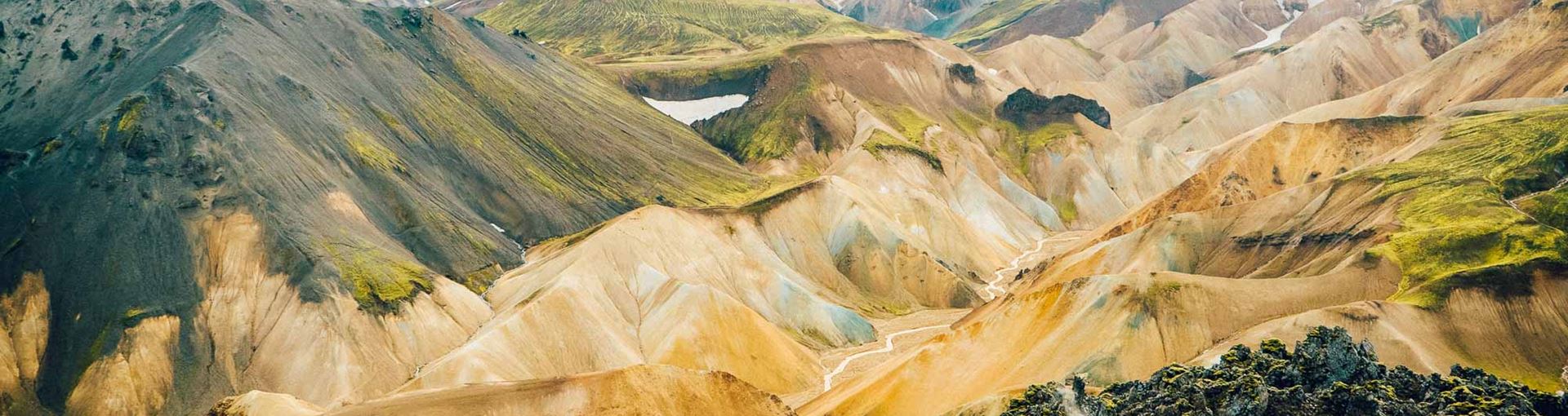 Landmannalaugar est situé dans la partie sud des spectaculaires Hautes Terres d'Islande et est probablement l’endroit le plus étonnant (bien que la compétition soit rude). Landmannalaugar surplombe un champ de lave noir jais, créé à l'origine lors d’une éruption en 1477, offrant de superbes vues sur des paysages volcaniques stupéfiants. Cela contraste magnifiquement avec le lieu lui-même, qui est composé de montagnes de rhyolite: un rocher incroyable, qui crée un large éventail de couleurs différentes sur le flanc de la montagne. C'est vrai que les montagnes changent réellement de couleur: offrant des nuances de rouge, jaune, vert et rose tout en changeant de couleur selon les rayons du soleil. C'est vraiment une nature sauvage intacte qui ne ressemble à aucun autre endroit sur Terre.