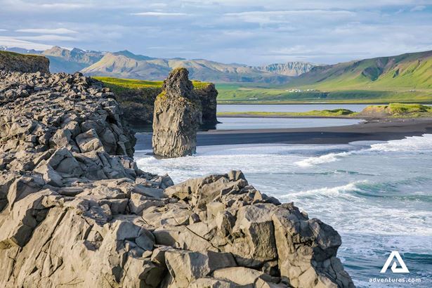 A l'Est, vous verrez la célèbre plage de sable noir de Reynisfjara. Le sable noir s’est formé par les roches volcaniques érodées. Au cours des innombrables années de processus, les plus grosses roches se sont fragmentées en minuscules cailloux et sont finalement devenues du sable. Des colonnes de basaltes se dressent également au large de la plage.