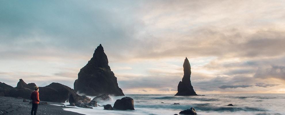 Next stop is the iconic Reynisfjara black sand beach, known for its basalt sea stacks and roaring Atlantic waves. It's often listed among the most beautiful non-tropical beaches in the world. After that, visit Skógafoss, a 60-meter-high (197 feet) waterfall with a staircase leading to panoramic views. On clear days, you might even spot Eyjafjallajökull Volcano above the cliffs.