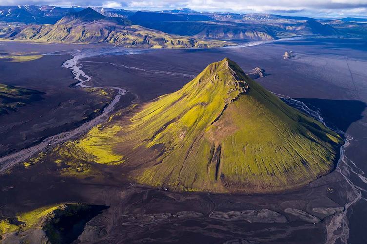 After a filling breakfast, your group will continue another exciting day of the hike. You’ll start by crossing a stream and walking into the wide black sand desert of Mælifellssandur. Along the way, you’ll pass two striking volcanoes, Stórasúla and Hattafell, and see their green moss-covered slopes stand out against the dark rocks.