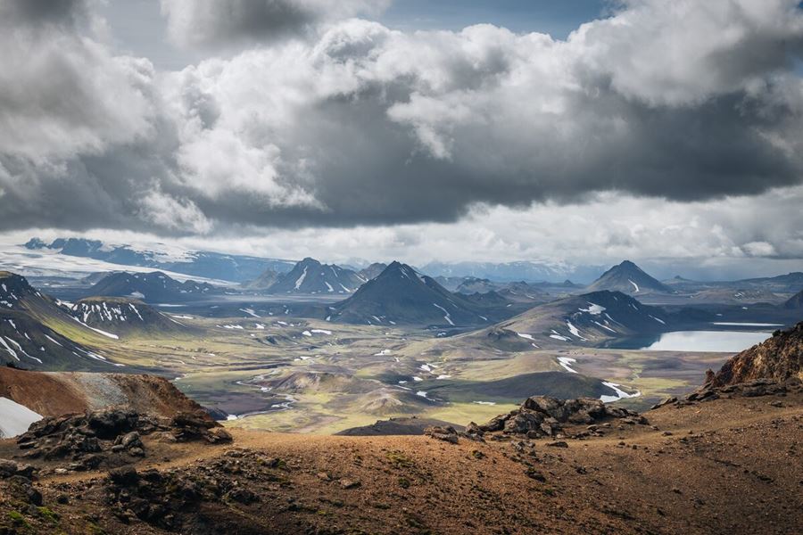 Begin the day by hiking through the Laugahraun lava field, passing the slopes of Brennisteinsalda and heading toward the steaming Reykjafjöll mountains. You’ll climb through narrow gorges, the Stórihver hot spring area, and striking mineral-painted ridges. Soon, the landscape changes dramatically to the black obsidian desert of Hrafntinnusker, where you’ll stop for lunch surrounded by this unique terrain.