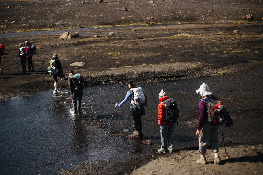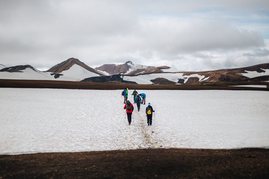 The Laugavegur Trail officially begins in the geothermal area of Landmannalaugar. Before the main trek starts the next day, you’ll head out on a warm-up hike to explore some of the area’s most scenic spots. You’ll walk past the rugged Laugahraun lava field, the colorful Grænagil canyon, and the dark slopes of Bláhnjúkur volcano. It’s a gentle first look at the trail’s wild beauty.