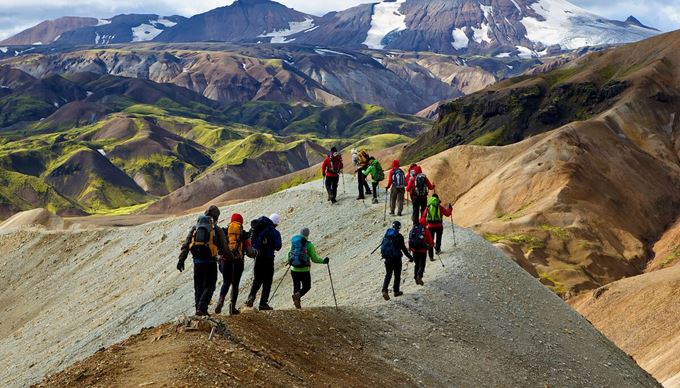 Iceland’s landscapes are among the most diverse on Earth, and the Laugavegur Trail lets you experience them up close. Discover rugged terrain, glacier views, rainbow-colored mountains, and stay in cozy mountain huts. You’ll understand why Iceland is called the “land of fire and ice” as you walk past lava rock formations, natural hot springs, and black sand deserts. The trail stretches 34 mi (55km) from Landmannalaugar to Þórsmörk and continues along the part of the volcanic Fimmvörðuháls Pass for 15 mi (25 km).
