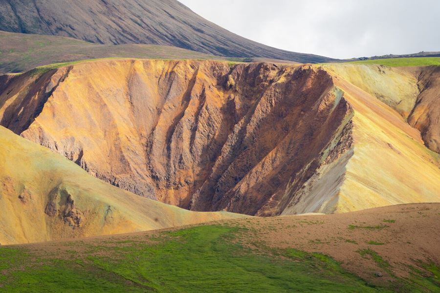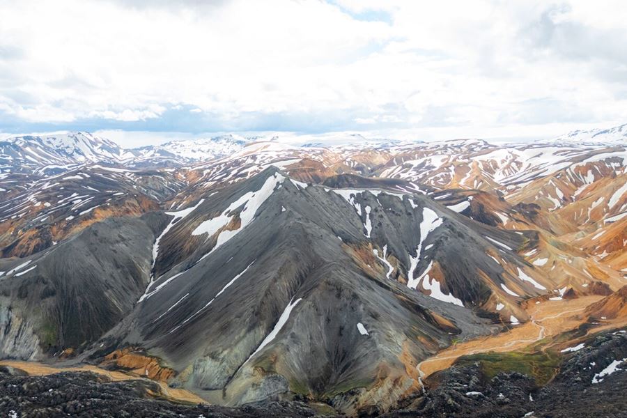 From Hrafntinnusker, the path descends into the gullies of Jökultungur—a geothermal wonderland dotted with steaming springs and bubbling mud pools. Over time, the geothermal activity has painted these gullies in vivid yellows and reds, contrasting beautifully with the beige peaks nearby. At the top of Jökultungur, enjoy the views of the Fjallabak region and, if the weather is clear, catch glimpses of Mýrdalsjökull, Eyjafjallajökull, and Tindfjallajökull glaciers.