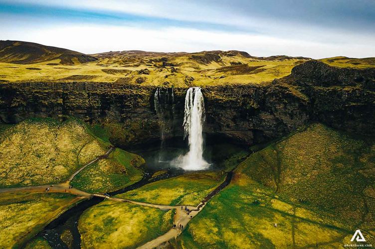 Seljalandsfoss is an unusual waterfall that cascades from ancient sea cliffs dropping down over 60 meters into a shallow pool. It is possible to take a walk behind the cascade of this waterfall and the scenery is really beautiful.