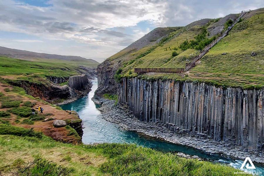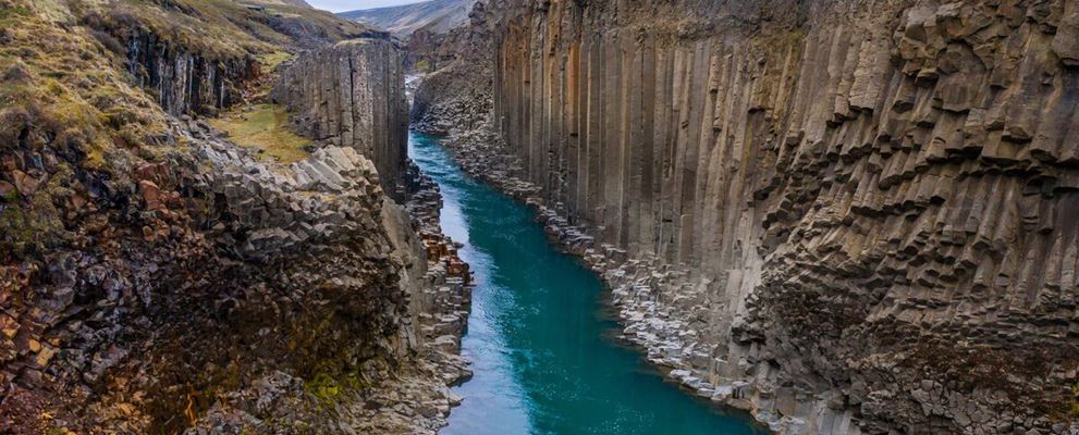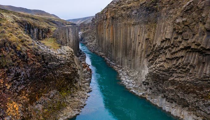 First, we will visit Stuðlagil Canyon, one of the world’s most enchanting basalt rock formations.* You’ll see towering basalt columns that rise from the striking turquoise waters of the Jökla River.