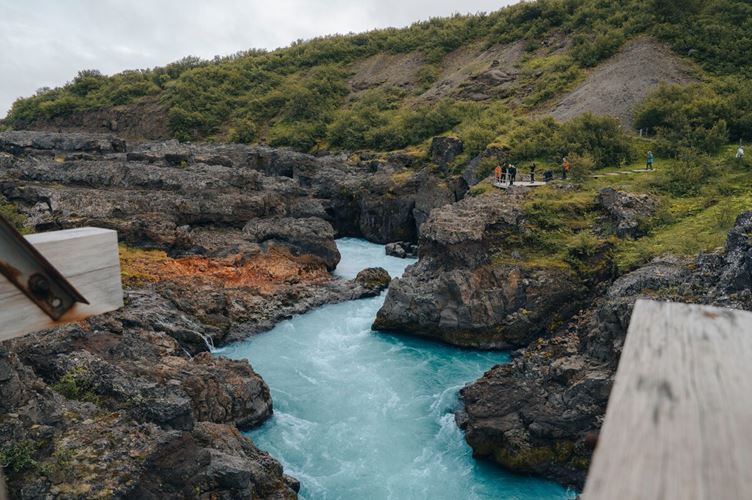 Just a short walk from Hraunfossar is Barnafoss, or “Children’s Waterfall.” According to legend, children tragically fell into its striking cyan waters, and your guide will share more of the story as we explore the area.