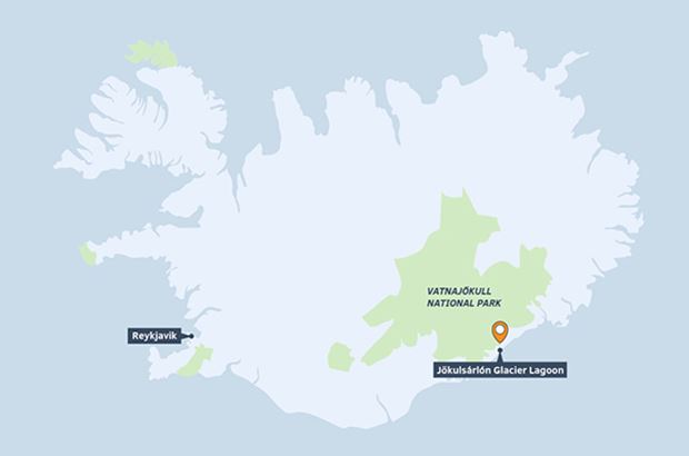 Your adventure begins at Jökulsárlón Glacier Lagoon in Southeast Iceland. This glacial lake is filled with icebergs that calve from Vatnajökull and drift slowly across the water before flowing into the Atlantic Ocean.