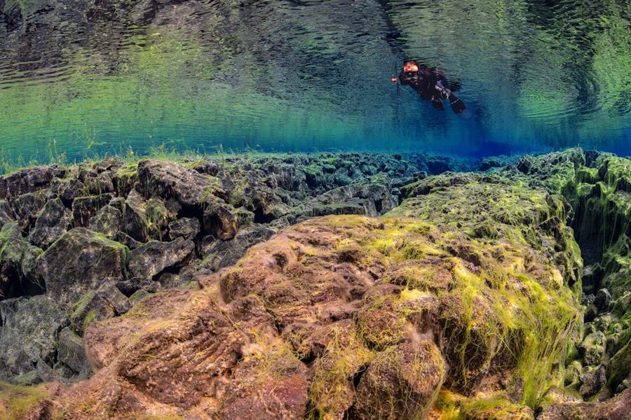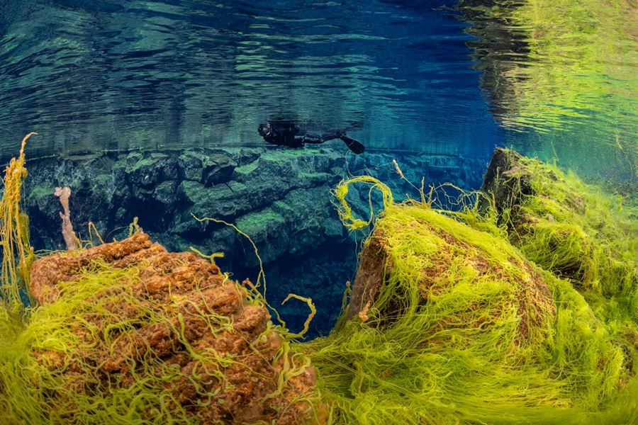 Occasionally fish venture into Silfra from Þingvallavatn lake, but they will quickly swim back as they don’t like the cold glacier water. However, there is a lot of colorful seaweed including a bright green variety known as ‘’troll hair’’, which makes the fissure unlike anything on the surface.