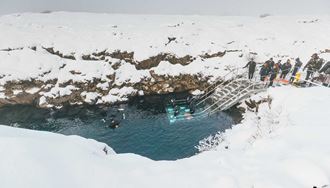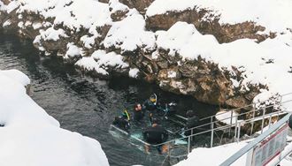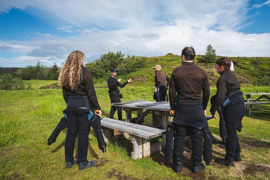 Before entering Silfra, your guide will help you gear up with a dry suit designed to keep you warm in the glacial water. Then, you’ll hear about the park’s unique geology and get a safety briefing on your equipment and tour. Once ready, it’s a short 150-meter (490-foot) walk to the entry point.