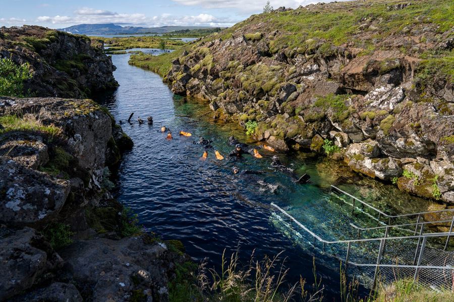 For the tour, you'll swim in the "lazy current," a glacial water stream that flows calmly in the fissure. The crystal water has been filtered for decades by lava rock and is so pure you can drink it. Marvel at the vibrant blue and green water shades, orange seaweed, and spectacular rock formations. The water at Silfra boasts 100-meter (328 ft) visibility, so you'll have the perfect conditions for exploring the geological wonders below.